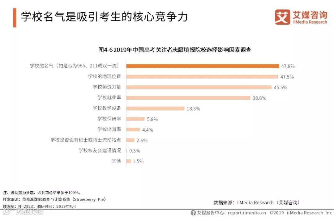 iiMedia Research(艾媒咨询)数据显示,占比47.8%的中国高考关注者在选择国内院校时注重学校的名气,占比47.5%的中国高考关注者志愿填报院校选择时优先考虑学校的地理位置。