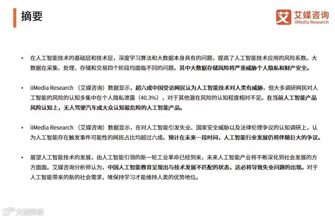iiMedia Research(艾媒咨询)数据显示,中国网民认为人工智能技术会引发大数据信息泄露,占比达38.6%。其次是人工智能或使得人类生存能力降低,占比为31.6%。