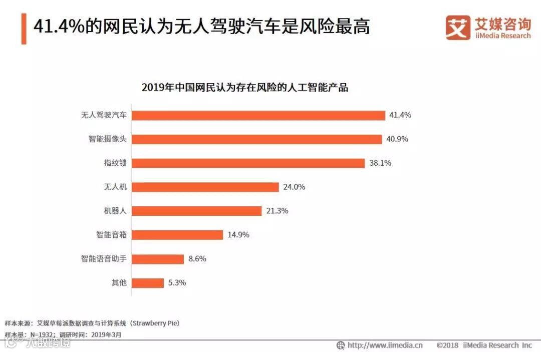 iiMedia Research(艾媒咨询)数据显示,41.4%的网民认为无人驾驶汽车是现阶段风险最高的人工智能产品,其次是智能摄像头(40.9%)和指纹锁(38.1%)。艾媒咨询分析师认为,无人驾驶汽车、摄像头和指纹锁都是与人类近距离接触且能产生直接效果的人工智能产品,这类产品无论是否存在技术不足,都与人类的利益攸兮相关。