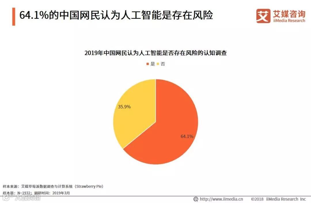 iiMedia Research(艾媒咨询)数据显示,64.1%的中国网民认为人工智能是存在风险/安全威胁的。