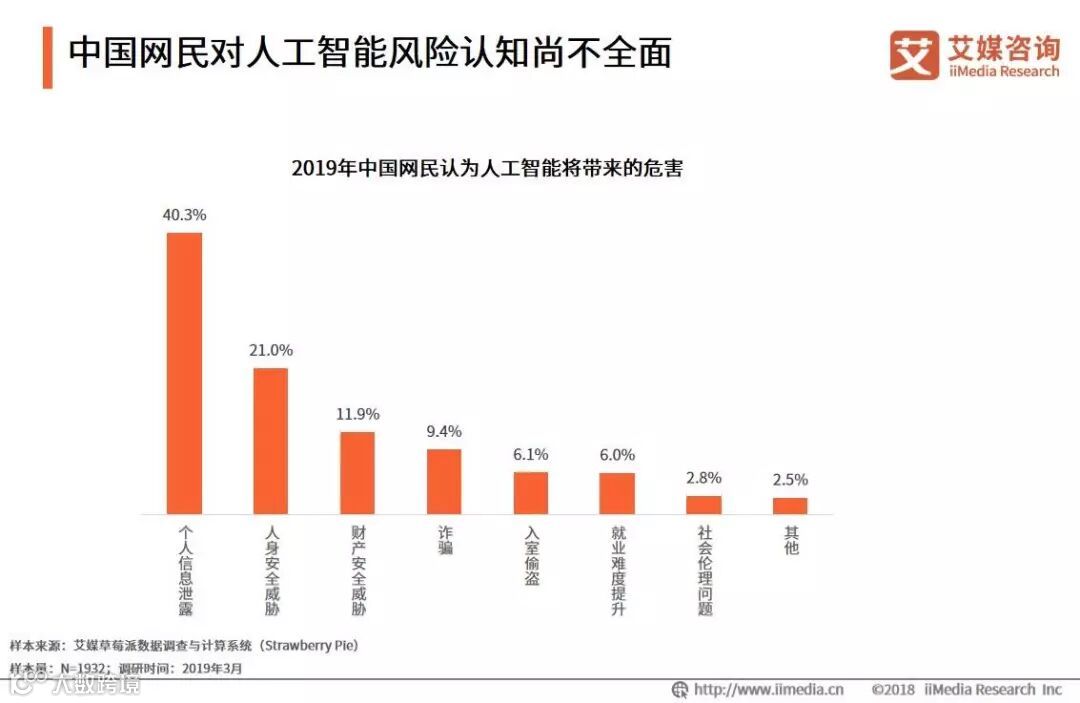 iiMedia Research(艾媒咨询)数据显示,40.3%的网民认为人工智能带来的最大危害就是个人信息泄露,其比重相对较高。艾媒咨询分析师认为,中国网民现阶段对人工智能存在的危害认知尚不全面。