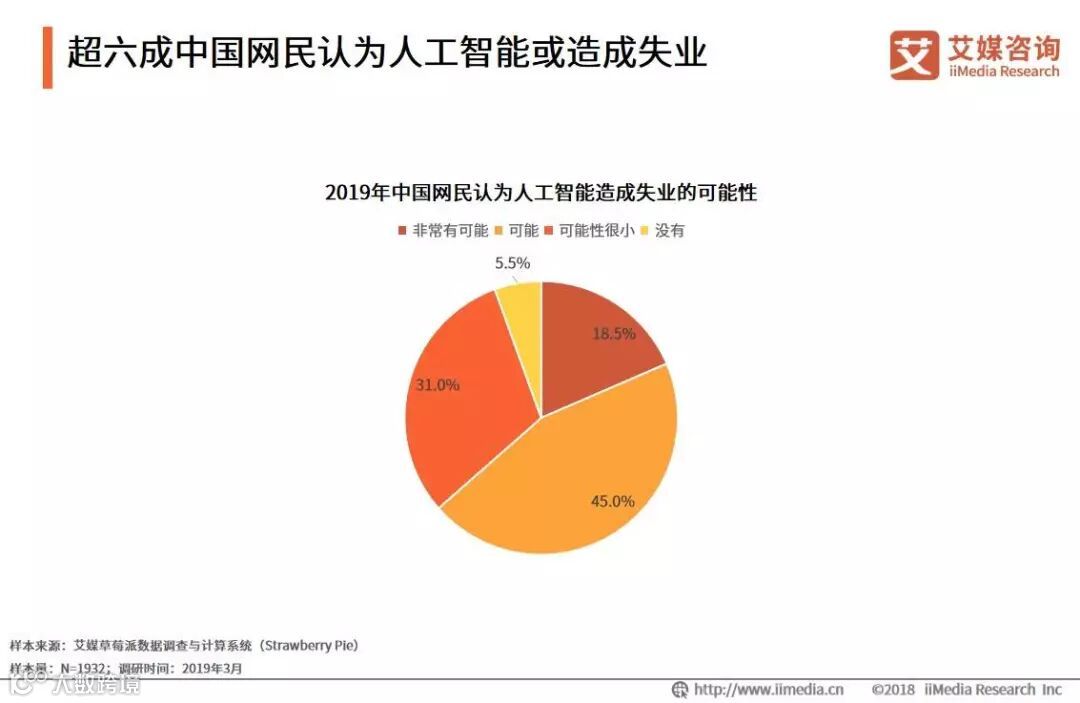 iiMedia Research(艾媒咨询)数据显示,45.0%的中国网民认为人工智能可能造成失业,18.5%的网民则认为人工智能非常有可能造成失业。