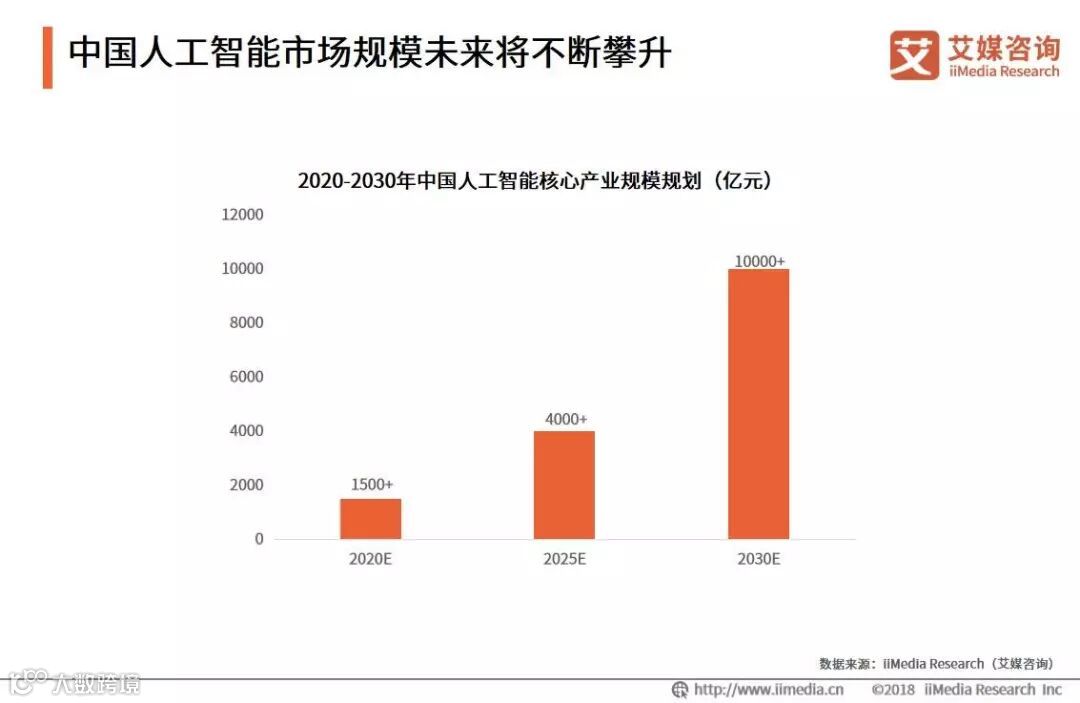 2017年中国国务院《新一代人工智能发展规划》中预计,到2020年人工智能总体技术和应用与世界先进水平同步,人工智能核心技术超过1500亿元;到2025年,人工智能基础理论实现重大突破,部分技术和应用达到世界领先水平,核心技术规模超过4000亿元。