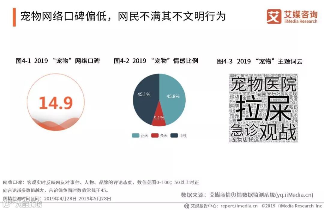 艾媒商情舆情数据监测系统显示,网民对“宠物”网络口碑偏负面,数值为14.9。在情感比例中,负面评价占9.1%。网民对“宠物”的负面舆情关键词集中在“拉屎”“宠物医院”等,网民对宠物不文明行为以及宠物医疗问题较为不满。