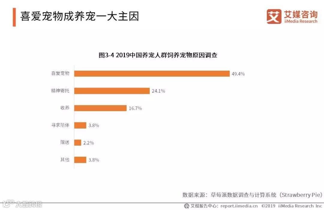 iiMedia Research(艾媒咨询)调查显示,在中国宠物人群饲养宠物原因调查中,喜爱宠物的养宠人群最多,占49.4%,其次为将宠物视为精神寄托,占24.1%。