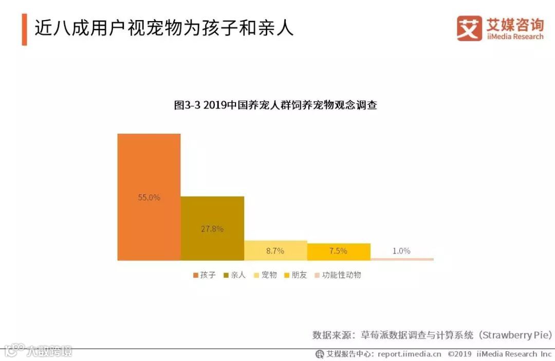 iiMedia Research(艾媒咨询)调查显示,在中国宠物人群饲养宠物观念调查中,将宠物视为孩子的养宠人群最多,占55.0%,其次为将宠物看成亲人,占27.8%,即近八成用户视宠物为孩子与亲人。只有1.0%的养宠人群将宠物认作功能性动物。艾媒咨询分析师认为,将宠物视为孩子或亲人,是宠物服务与宠物用品营销“拟人化”与“个性化”得以成功的基础。