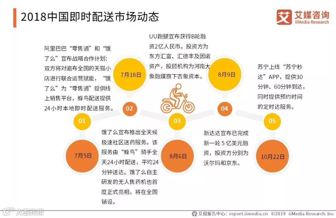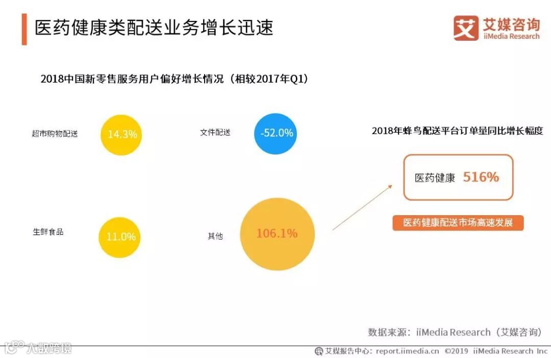 iiMedia Research(艾媒咨询)数据显示,2018年第四季度中国即时配送平台用户选择其他类型的配送服务所占比例较2017年第一季度增长率为106.1%。数据显示,2018年蜂鸟配送平台医药健康类目订单量同比增长率达到516%,市场发展潜力巨大。