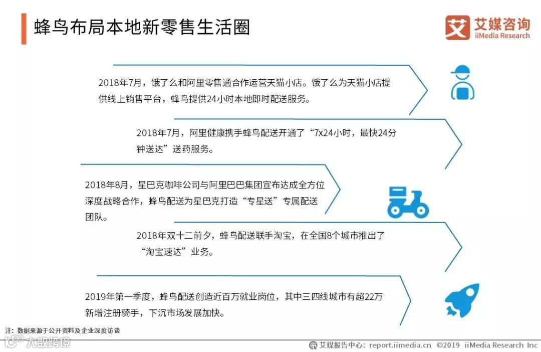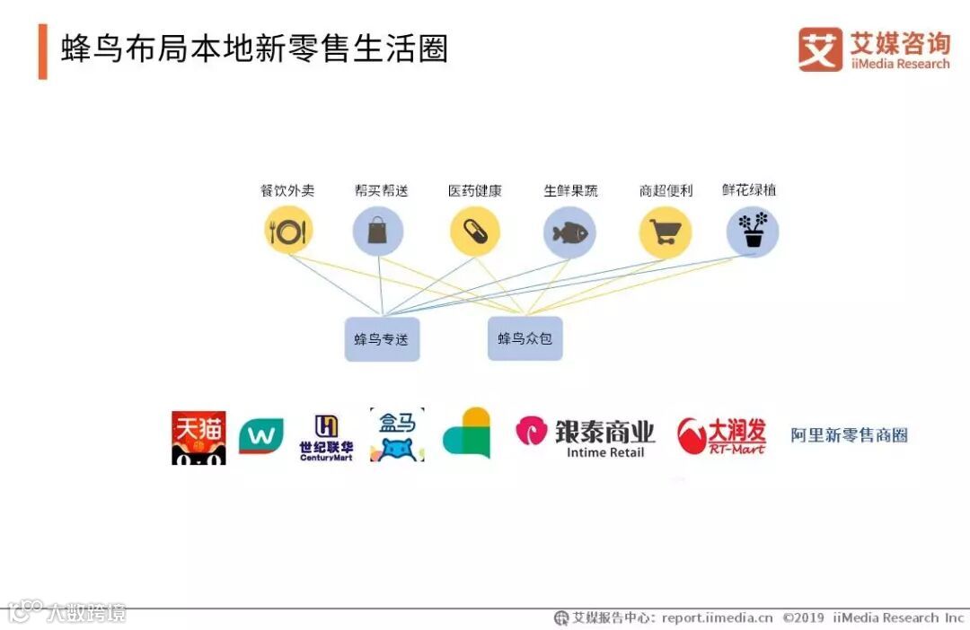 蜂鸟配送是饿了么旗下平台,拥有专送、众包两种运力模式。2018年6月,饿了么全面融入阿里新零售体系,饿了么为阿里带来本地生活的更多流量,而阿里新零售体系则同样赋能蜂鸟,带来更广阔的平台和布局。包括支付宝、苏宁、天猫、盒马、银泰等品牌的本地生活圈已经逐步形成。