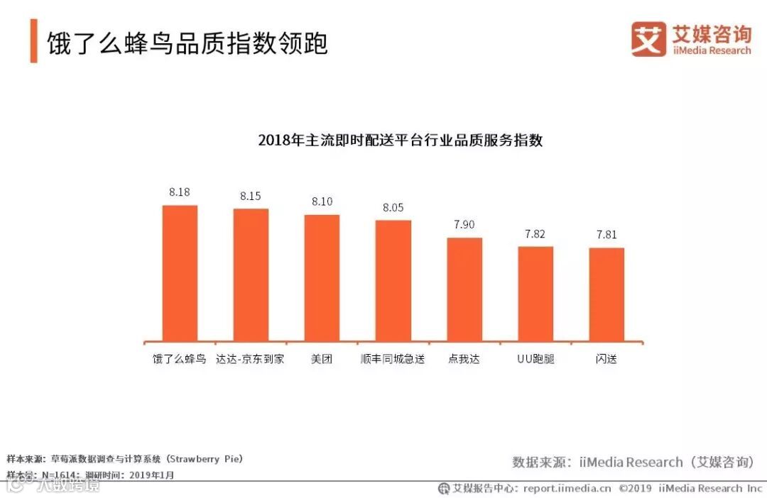 iiMedia Research(艾媒咨询)数据显示,饿了么蜂鸟的品质服务指数最高,达达-京东、美团和顺丰同城急送也位居前列。艾媒咨询分析师认为,外卖平台和电商平台依托原有的配送团队和前期业务带来的巨大流量,在即时配送领域更容易营造良好品牌形象。第三方即时配送平台起步较早,在C端和中小商户即时配送领域也取得了一定成就。