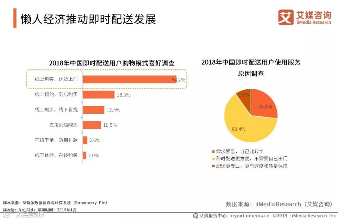 iiMedia Research(艾媒咨询)数据显示,54.2%的受访用户倾向于使用线上购买,送货上门的购物方式,而绝大多数受访用户使用即时配送服务主要出于“忙懒急”的原因。艾媒咨询分析师认为,即时配送服务的出现填补了社区生活空白,其线上下单购物,并实现短时间内收取货品的模式受喜好程度高,相比其他如线下到店购买等模式,效率更高,满足了懒人经济下增长的需求。