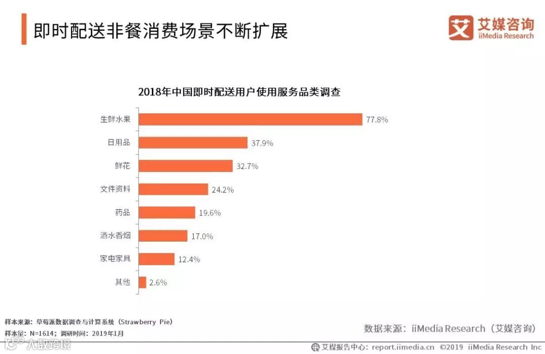 iiMedia Research(艾媒咨询)数据显示,77.8%的受访用户使用过生鲜水果类即时配送,生鲜水果、日用品和鲜花的配送服务使用频率最高。艾媒咨询分析师认为,随着生鲜领域的垂直电商大量涌现,以及新零售模式的规模扩张,各品类的即时配送消费习惯逐渐形成,需求明显增长,消费场景也在不断扩展。