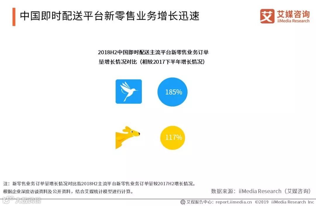iiMedia Research(艾媒咨询)数据显示,2018年下半年蜂鸟配送及美团配送新零售业务均有显著增长,其中蜂鸟配送2018年第四季度新零售业务订单量较第二季度增长185%,美团配送新零售业务订单量增长117%。艾媒咨询分析师认为,基于即时配送市场的逐步成熟,蜂鸟配送和美团配送正在加速探索新零售业务,未来新零售业务将是即时配送主流平台的新竞技场。