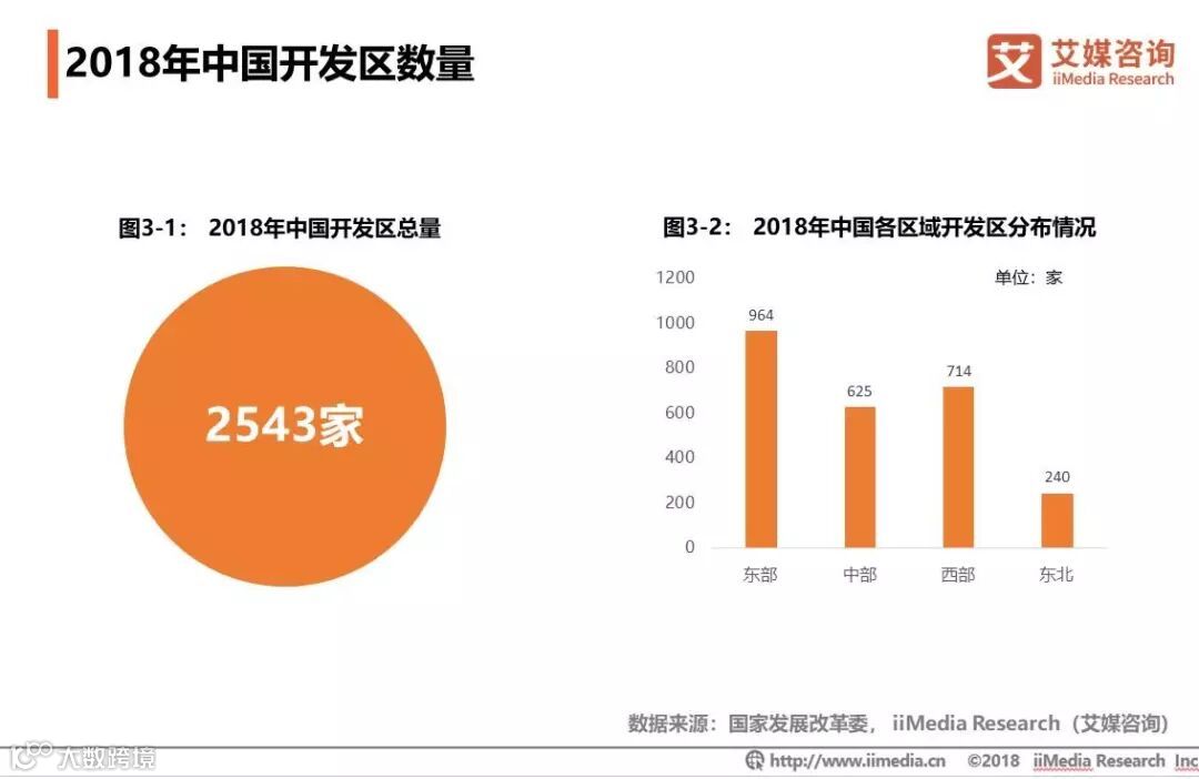 根据2018年3月发布的《中国开发区审核公告目录(2018年版)》显示,中国现有2543家开发区,其中国家级开发区552家和省级开发区1991家。地区分布比较均衡,其中东部地区有964家开发区,中部地区有625家开发区,西部地区有714家开发区,东北地区有240家开发区。