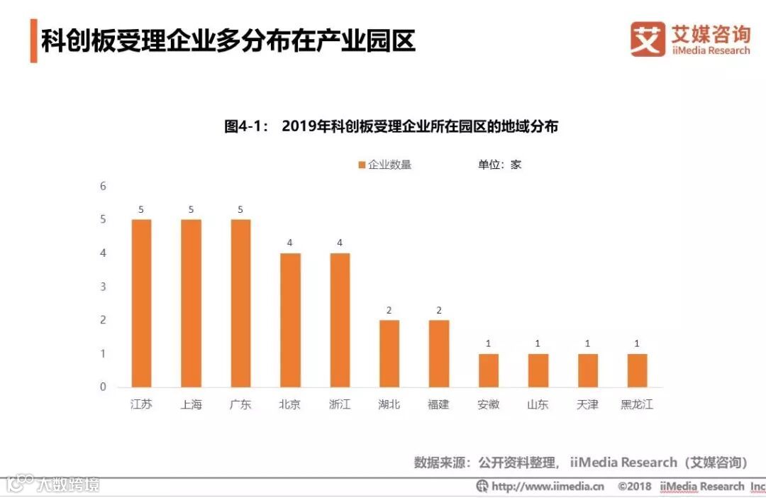2019年,科创板自获批以来一直在火速推进。截至4月1日,上海证券交易所共受理了31家企业,注册地信息显示其中28家受理企业在产业园区,占比超过90%。从省份分布来看,江苏、上海和广东的产业园区数量最多,各有5家企业。