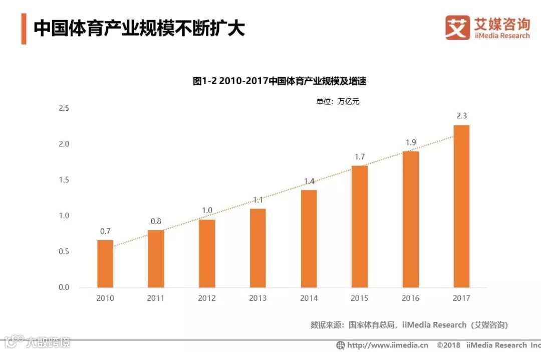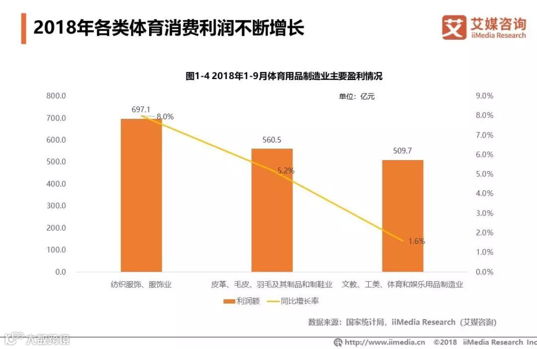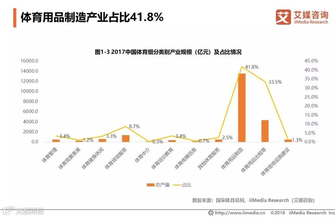 iiMedia Research(艾媒咨询)数据显示,2017年体育用品制造占比41.8%,规模为体育各细分产业之首。
