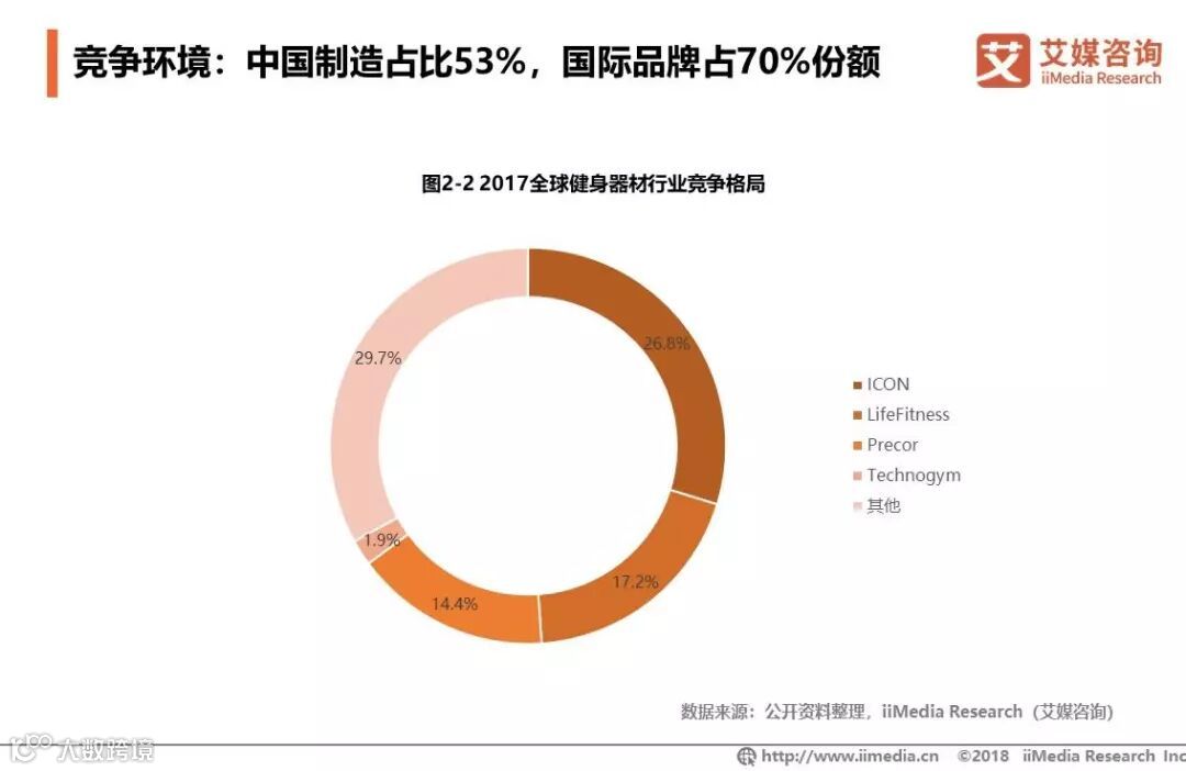 2017年,全球健身器材市场近108亿美元,中国制造占比约为53%。但是大部分体育器材厂家主要通过为国际知名品牌贴牌加工参与国际市场竞争。全球健身器材产业的品牌集中度较高,主要品牌ICON、LifeFitness、Precor、Technogym,占据全球70%的市场份额。