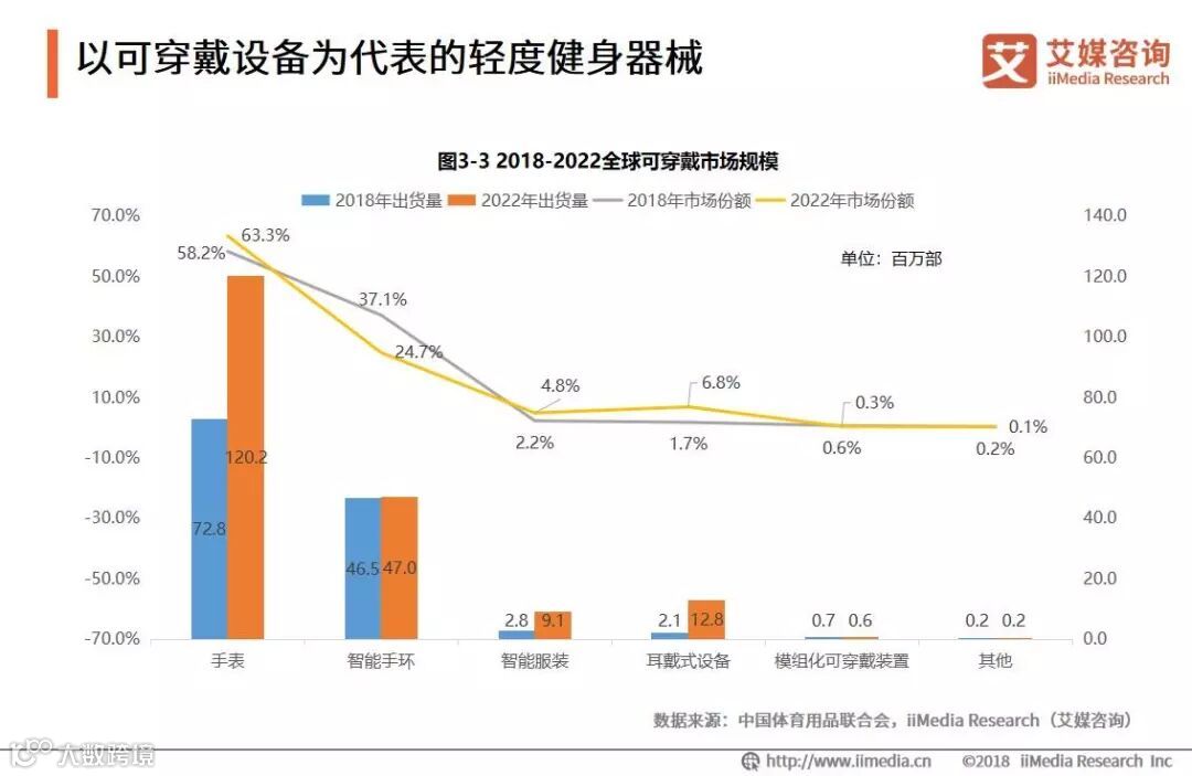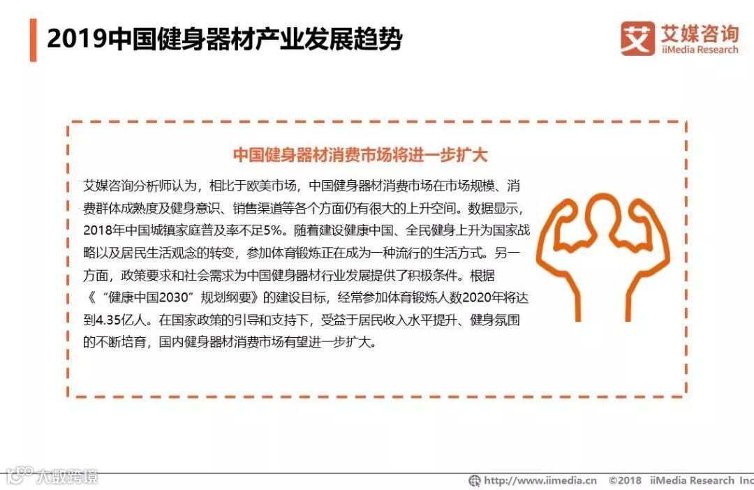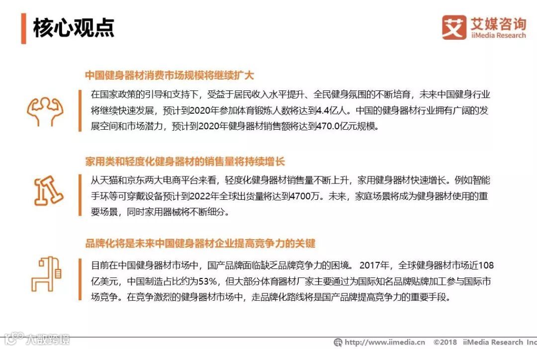 在国家政策的引导和支持下,受益于居民收入水平提升、全民健身氛围的不断培育,未来中国健身行业将继续快速发展,预计到2020年参加体育锻炼人数将达到4.4亿人。中国的健身器材行业拥有广阔的发展空间和市场潜力,预计到2020年健身器材销售额将达到470.0亿元规模。根据电商平台的数据显示,轻度化健身器材销售量不断上升,家用健身器材快速增长。例如智能手环等可穿戴设备预计到2022年全球出货量将达到4700万。未来,家庭场景将成为健身器材使用的重要场景,同时家用器械将不断细分。目前在中国健身器材市场中,国产品牌面临缺乏品牌竞争力的困境。2017年,全球健身器材市场近108亿美元,中国制造占比约为53%,但大部分体育器材厂家主要通过为国际知名品牌贴牌加工参与国际市场竞争。艾媒咨询分析师认为,在竞争激烈的健身器材市场中,走品牌化路线将是国产品牌提高竞争力的重要手段。(《2019年中国健身器材产业研究与发展趋势预测报告》完整高清PDF版共67页,可点击文章底部下载按钮进行报告下载。)