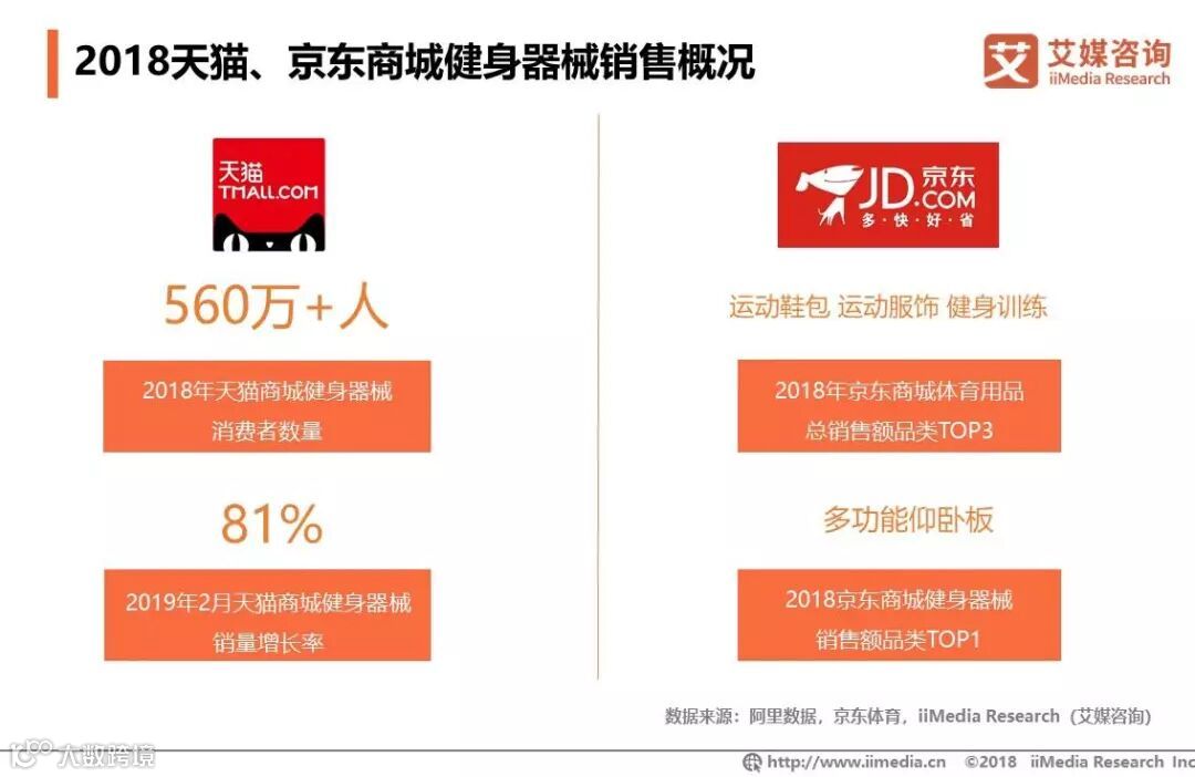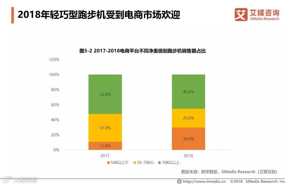 iiMedia Research(艾媒咨询)数据显示,从健身器械的机器重量来看,2018年轻巧型跑步机受到电商市场欢迎。2018年50KG以下的跑步机销售占比提升至30.0%,而重型机器销售额占比下滑。