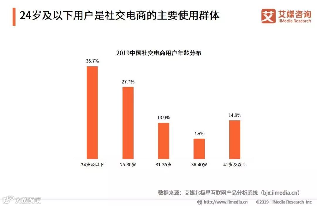 iiMedia Research(艾媒咨询)数据显示,24岁及以下社交电商用户占比35.7%;其次是25-30岁用户,占比27.7%。