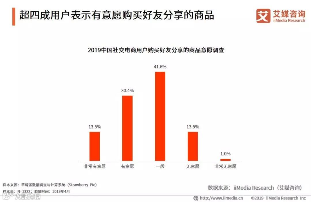 iiMedia Research(艾媒咨询)数据显示,受访社交电商用户中超四成表示有购买好友分享的商品的意愿,其中“非常有意愿”的占比是13.5%,“有意愿”的占比是30.4%。