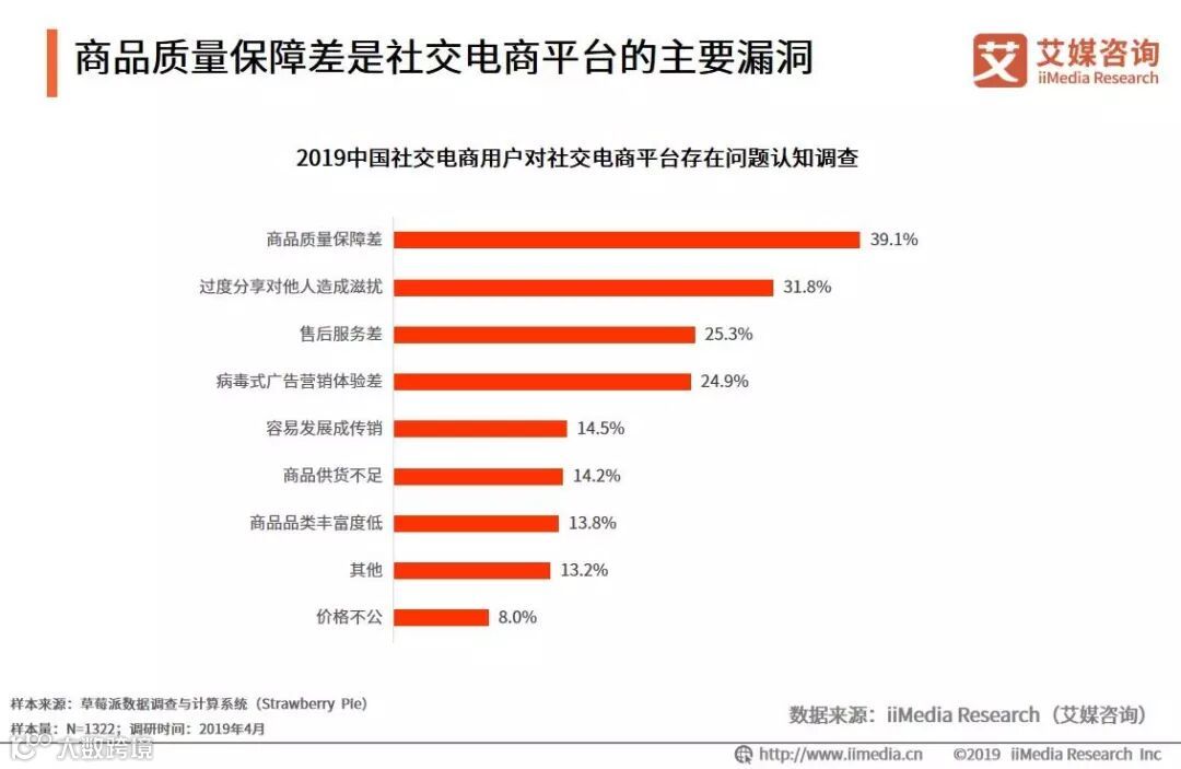 iiMedia Research(艾媒咨询)数据显示,受访社交电商用户表示目前社交电商平台存在问题主要有商品质量保障差、过度分享对他们造成滋扰、售后服务差,占比分别是39.1%、31.8%、25.3%。