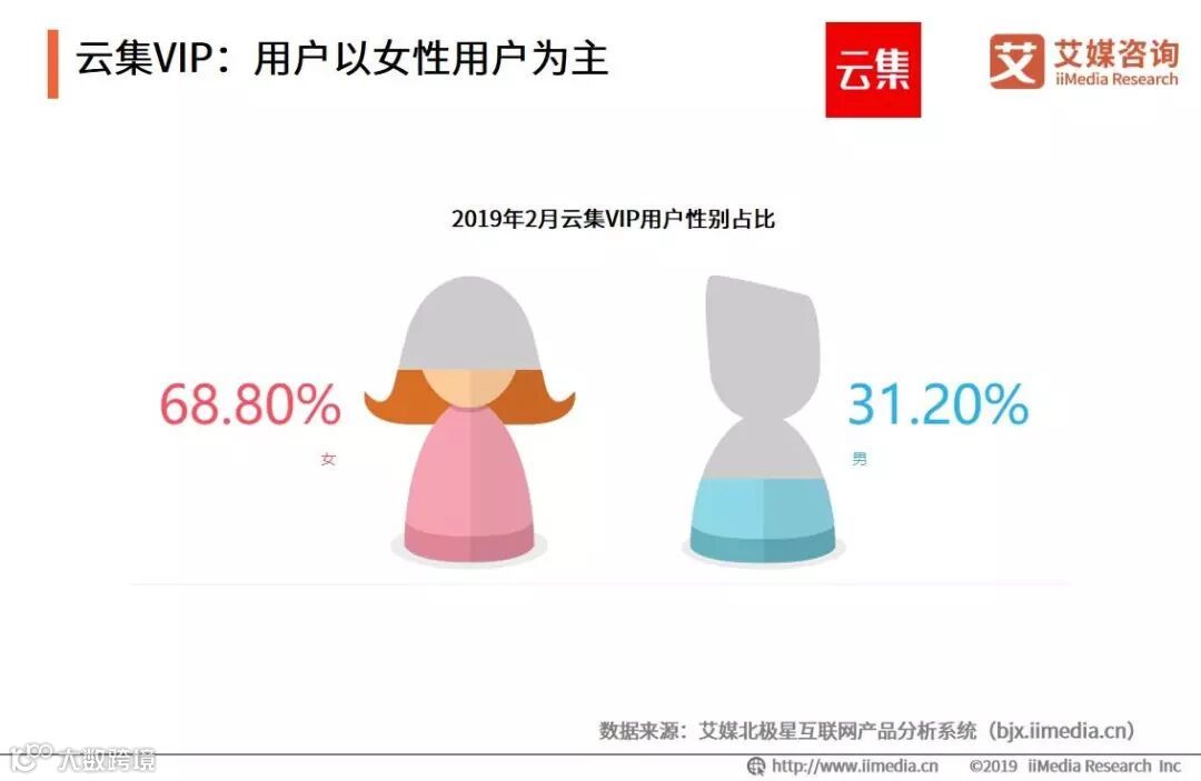 iiMedia Research(艾媒咨询)数据显示,云集VIP女性用户比例为68.80%,而男性用户比例则为31.20%。