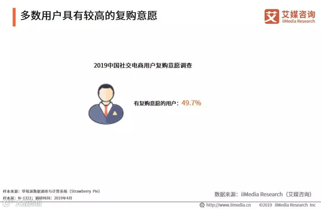 iiMedia Research(艾媒咨询)数据显示,较多受访社交电商用户有意愿到社交电商平台上再次购买产品,占比是49.7%。艾媒咨询分析师认为,社交电商上的商品和服务具有价格低的优势,低廉的价格对用户具有较高吸引力,因此用户普遍愿意继续在平台上进行消费。