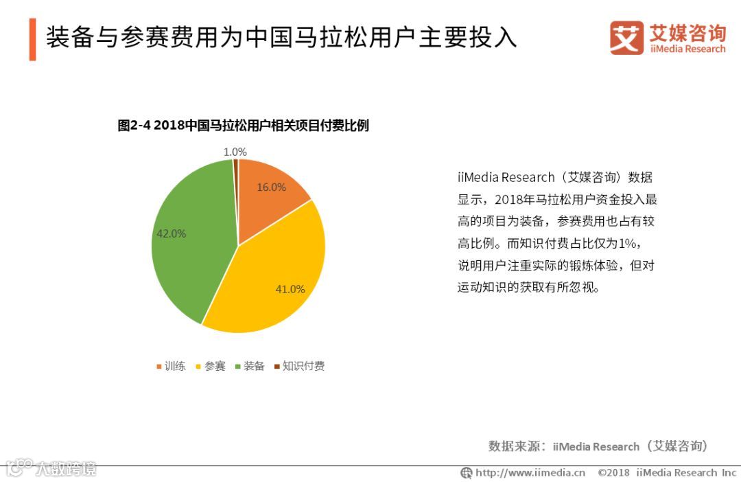 iiMedia Research(艾媒咨询)数据显示,2018年马拉松用户资金投入最高的项目为装备,参赛费用也占有较高比例。而知识付费占比仅为1%,说明用户注重实际的锻炼体验,但对运动知识的获取有所忽视。