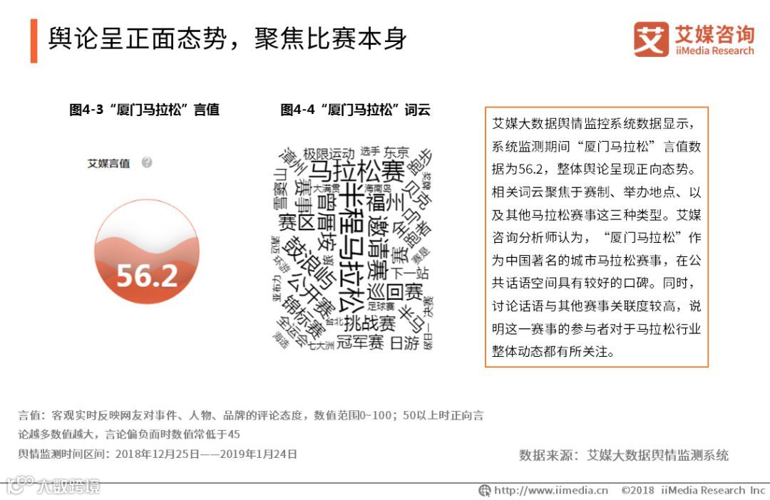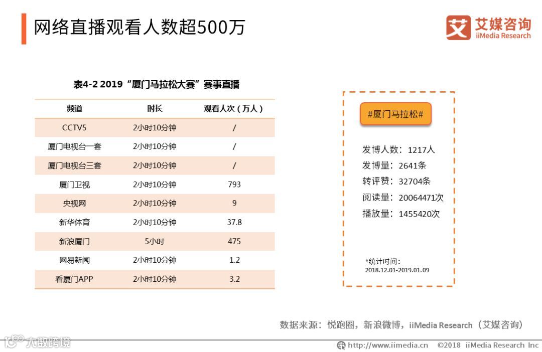 iiMedia Research(艾媒咨询)数据显示,2019厦门马拉松大赛中积极利用新浪、网易等新媒体平台进行直播,观看人次仅次于厦门卫视。同时,官方微博话题相关话题阅读量破2000万,说明这一赛事受到了大量关注。