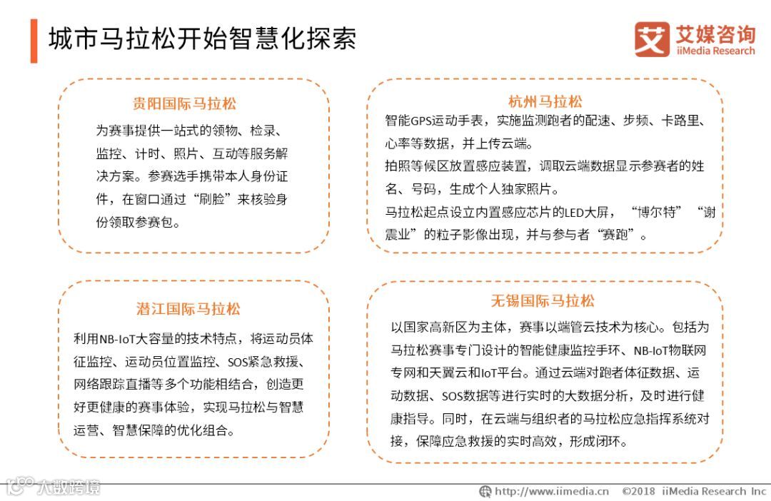 近年来,国家体育总局出台了大量政策,规范、加强马拉松赛事组织管理,为马拉松产业进一步发展提供了积极影响。同时,随着互联网、大数据等技术的快速发展,从国家层面开始鼓励智能装备、物联网等应用于马拉松产业,为马拉松“科技化”趋势奠定了条件。2018年出台的《“健康中国”马拉松系列赛2019年规划》,明确提出科技助“跑”未来的口号。