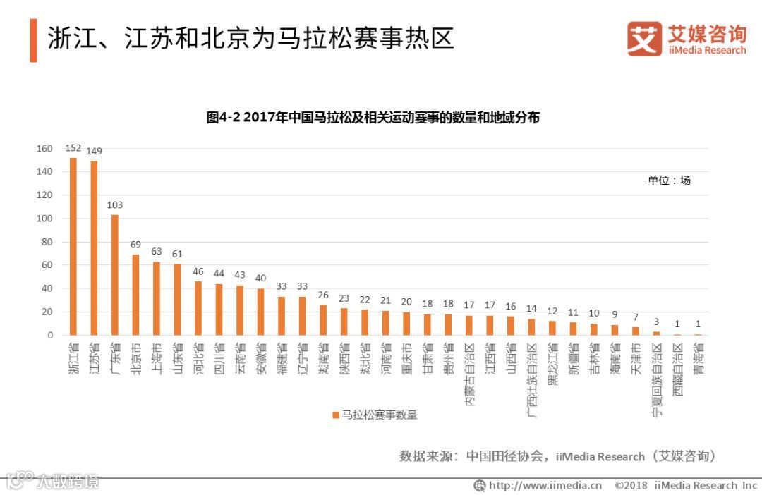 iiMedia Research(艾媒咨询)数据显示,浙江(152)、江苏(149)和广东(103)三省在马拉松赛事数量上遥遥领先,北京、上海和山东举办数量也突破60场。艾媒咨询分析师认为,赛事地区分布情况与中国经济实力强弱格局高度吻合,说明马拉松赛事的举办依托于一定的经济基础和消费需求。