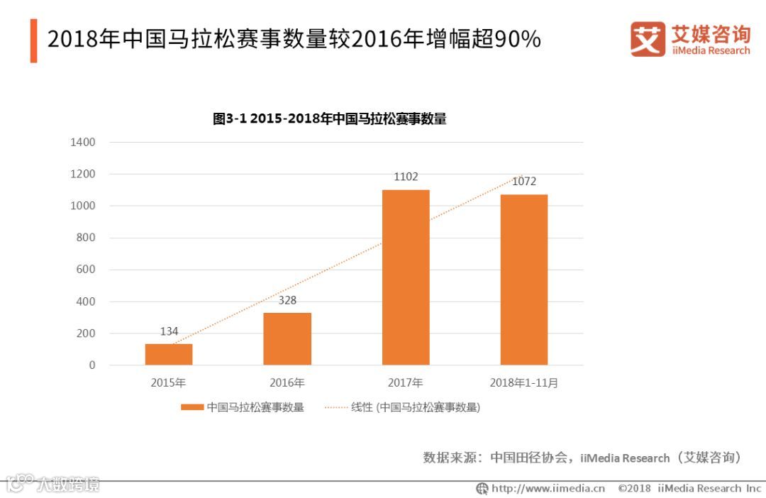 iiMedia Research(艾媒咨询)数据显示,2015年起中国马拉松赛事数量总体呈上升趋势。2018年1-11月,中国共举办马拉松类比赛1072场,接近2017年全年1102场。相较2016年,增幅在90%以上,增长迅速。