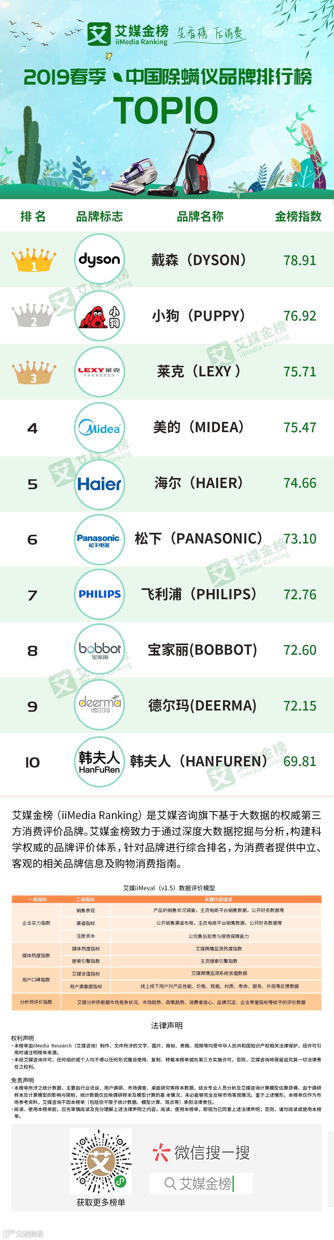 随着健康需求的增长以及消费者对除螨仪了解的深入,除螨仪市场进入了高速增长期,也吸引了前赴后继的入局者。对此,艾媒金榜(iiMedia Ranking)发布了《2019春季·中国除螨仪品牌排行榜TOP10》榜单,此次榜单是采用艾媒独有的iiMeval大数据评价模型,结合品牌实力评价、产品市场认可度、媒体热度指数、用户口碑指数、分析师评价指数等多个维度针对品牌进行综合评价与排名。戴森、小狗、莱克、美的、海尔、松下、飞利浦、宝家丽、德尔玛、韩夫人十大除螨仪品牌凭借综合实力成功上榜。