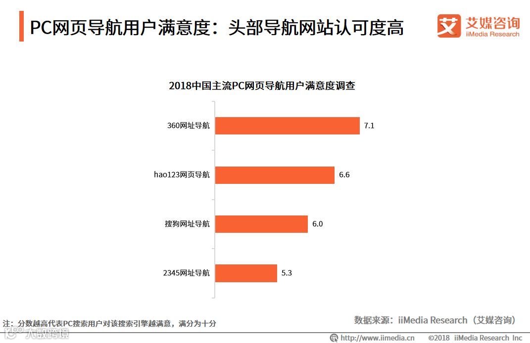 iiMedia Research(艾媒咨询)显示,PC网页导航用户对360网址导航的满意度较高,达到7.1分,其次是hao123网页导航,6.6分。艾媒咨询分析师认为,现阶段头部导航网站的用户认可度都比较高,而随着用户更加注重使用的整体体验,360网址导航在广告去除、安全性能方面具有优势,其整体用户满意度更高。