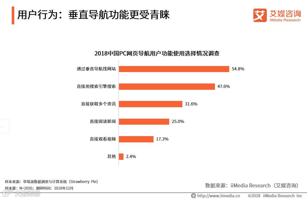 iiMedia Research(艾媒咨询)数据显示,在2018中国PC网页导航用户功能使用选择情况调查中,超五成的用户会在导航页上通过垂直导航找到自己所需的网站,另外有47.6%的用户在导航页上直接用搜索引擎搜索所需内容。艾媒咨询分析师认为,随着互联网的发展,导航网站也在逐渐演变,导航站由综合逐渐演变为分类更精细专业、垂直化更强的领域导航网站,更精准地匹配用户需求,具有一定发展前景。