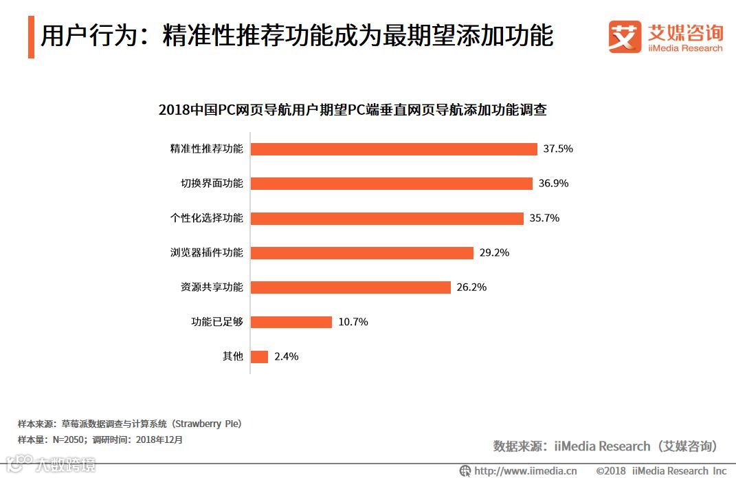 iiMedia Research(艾媒咨询)数据显示,2018中国PC网页导航用户期望PC端垂直网页导航添加功能调查中,精准性推荐功能占比37.5%,期望能够切换到更简洁的界面以及添加个性化选择功能的用户分别占比36.9%及35.7%。PC导航网页需要在精准性推荐上进行着力,不断追求技术的创新和产品的更新迭代。