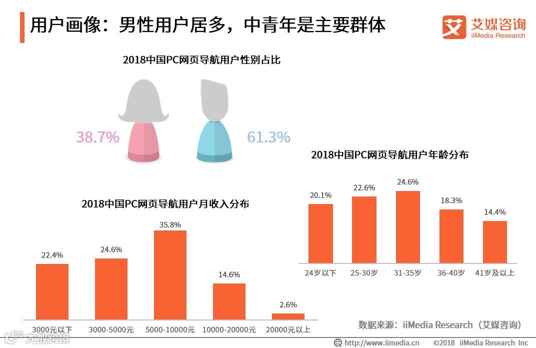艾媒北极星数据显示,2018中国PC网页导航用户中男性占比达61.3%,男性用户居多;35岁以下用户占比67.3%,中青年用户群体更多;另外,在用户收入分布中,5k-10k的用户占比达35.8%,中高收入的用户更常使用PC导航网站。