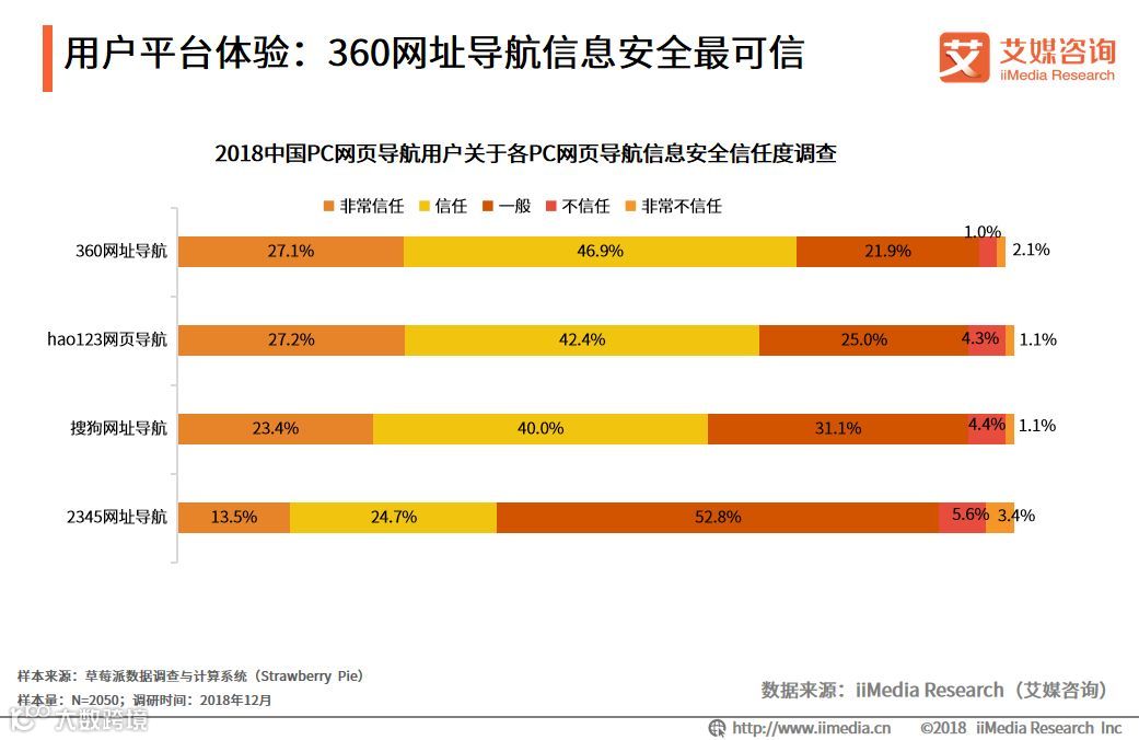 iiMedia Research(艾媒咨询)数据显示,2018中国PC网页导航用户关于各PC网页导航信息安全信任度调查中,360网址导航最受用户信任,表示非常信任和信任的用户占比达74.0%,360网址导航以安全性来进行推广,其信息安全信任度最高。