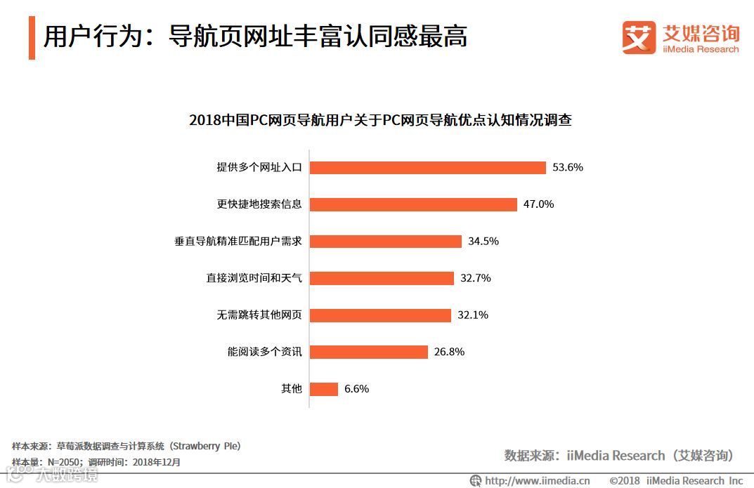 iiMedia Research(艾媒咨询)数据显示,在2018中国PC网页导航用户关于PC网页导航优点认知情况调查中,53.6%的用户认同导航页是网址聚集地,同一网页提供了多个网址入口的优点,另外47.0%的用户认同导航页能够更快捷搜索信息的优点,导航页网址丰富在用户中认同感最高。