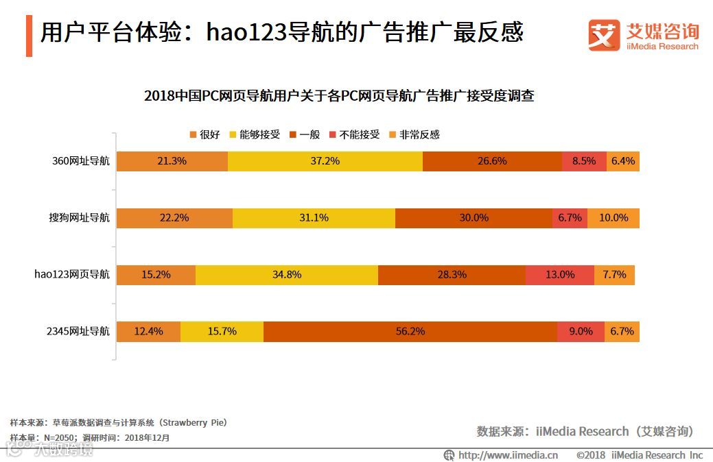 iiMedia Research(艾媒咨询)数据显示,2018中国PC网页导航用户关于各PC网页导航广告推广接受度调查中,让用户感到不能接受和非常反感的网页导航广告推广中,hao123网页导航以20.7%的占比排名首位。