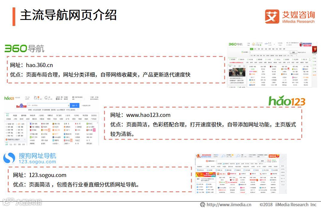 iiMedia Research(艾媒咨询)数据显示,在2018年中国PC网页导航用户首选品牌分布中,360网址导航以46.1%的占比成为用户首选品牌的第一位,随后是占比36.6 %的hao123网页导航和占比8.3%的2345网址导航。