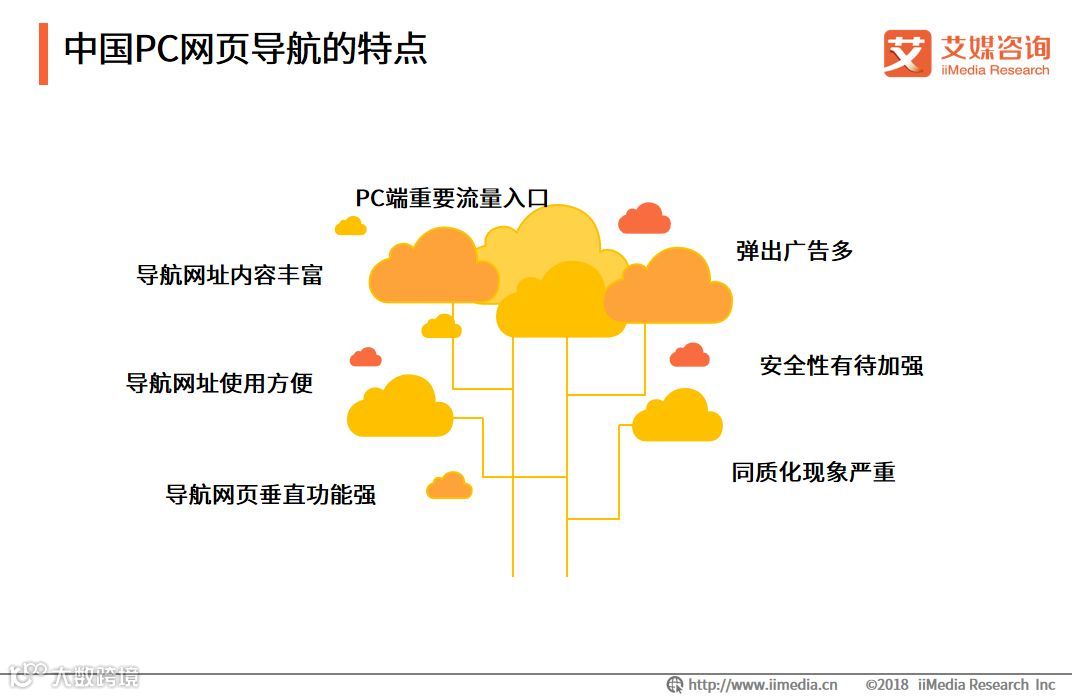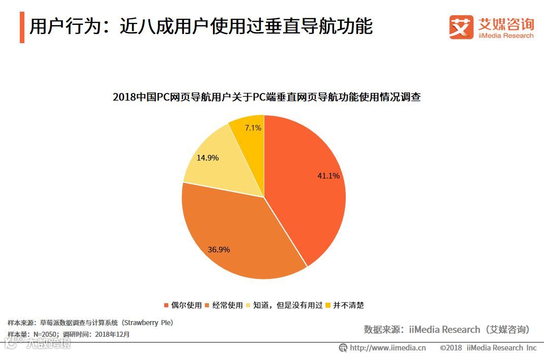 iiMedia Research(艾媒咨询)数据显示,近八成的受访用户知道导航网站的垂直导航功能并且使用过,垂直导航功能帮助PC端用户提高了效率,为PC导航网站带去更多的流量。