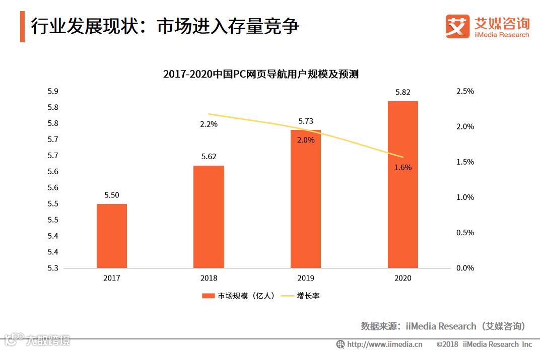 iiMedia Research(艾媒咨询)数据显示,2018年的PC网页导航用户规模为5.62亿人,中国PC网页导航用户规模呈缓慢增长态势,预计2019年的PC用户规模将达5.73亿人。