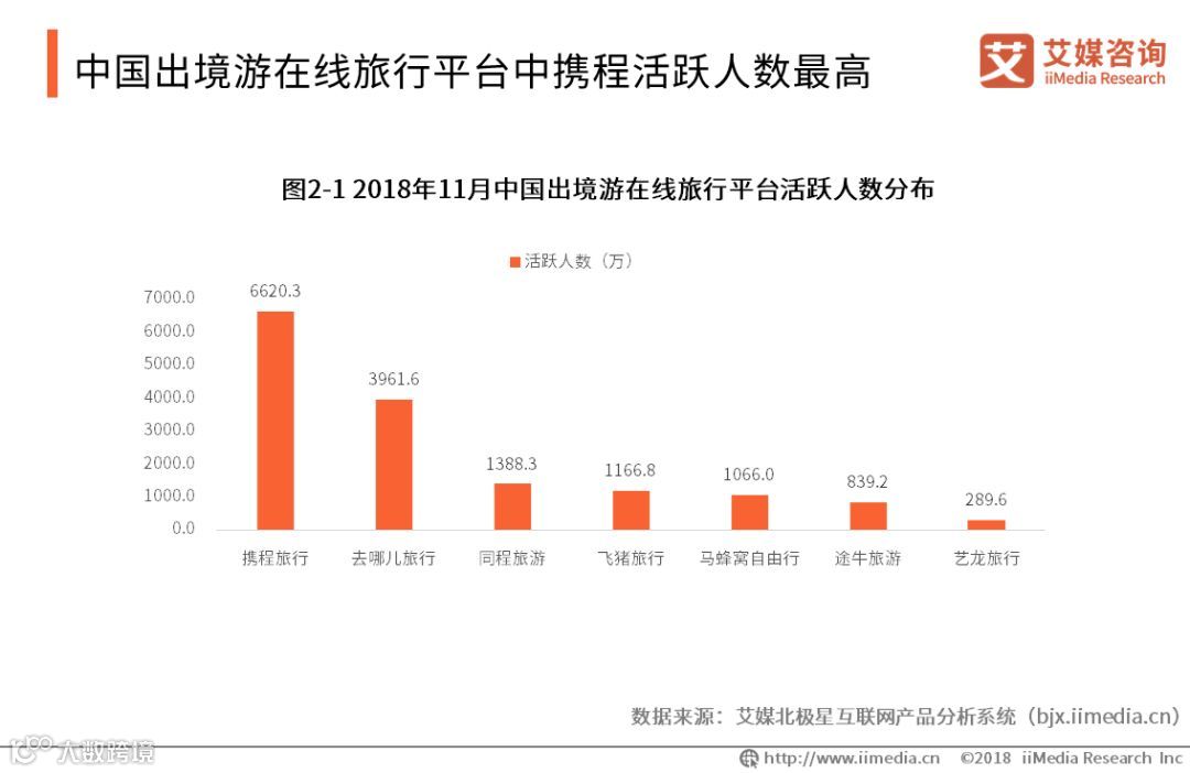 中国出境游在线旅行平台中携程活跃人数最高