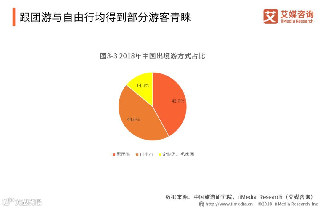在跟团游以及自由行的选择上,跟团游依然火爆,2018年跟团游与自由行分别占42.0%与44.0%。另外,定制游、私家团产品因为省心省力、自由度大,也获得较多人的青睐。