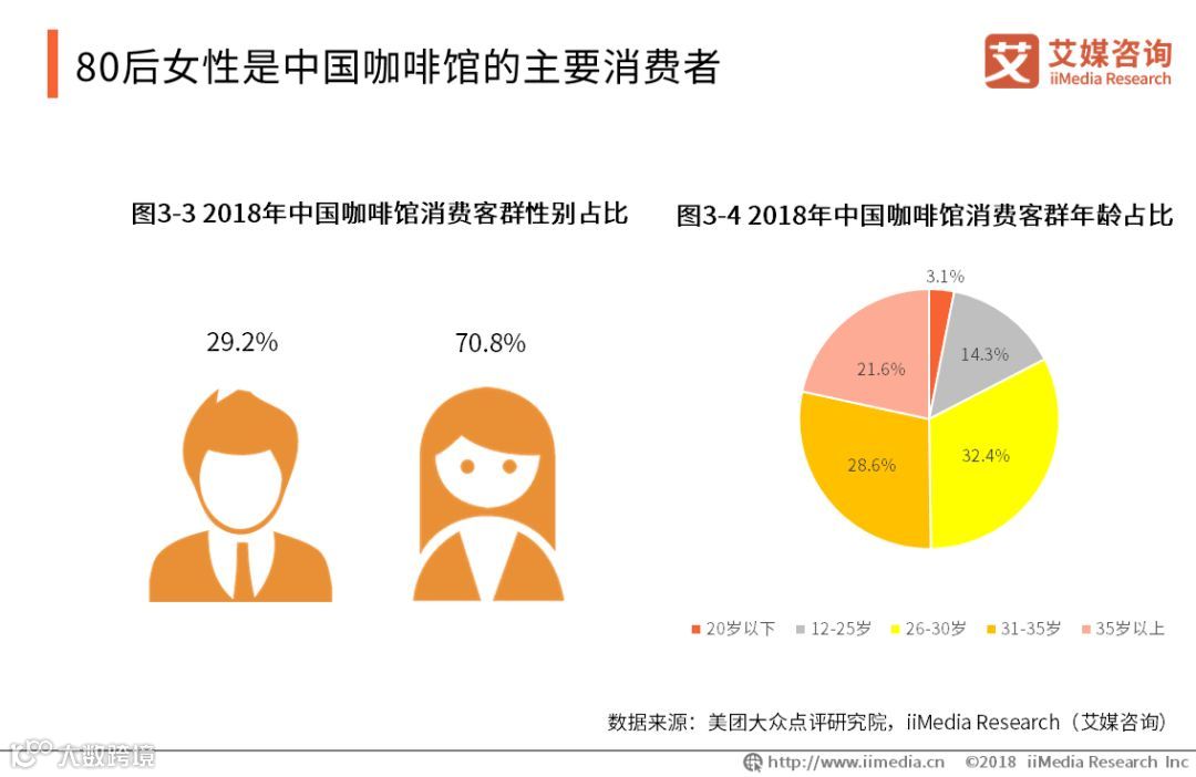 随着公众饮食观念的转变,中国咖啡市场正在进入一个高速发展的阶段。iiMedia Research(艾媒咨询)数据显示,预计2020年中国咖啡市场规模将达3000亿元。现磨咖啡市场仅占整个中国咖啡市场的18.0%,具有较大的发展潜力。新零售咖啡受到资本市场的关注。从消费者角度看,70.8%的咖啡馆消费者是女性,61.0%咖啡馆消费者年龄位于26到35岁之间。消费者更多地关注咖啡馆、精品咖啡等与咖啡相关话题。(《2018-2019中国咖啡产业商业模式及用户画像研究报告》完整高清PDF版共42页,可点击文章底部下载按钮进行报告下载。)