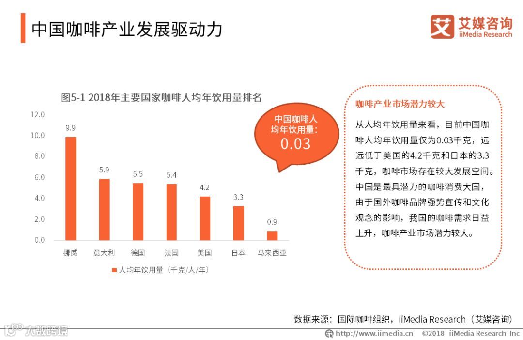 从咖啡饮用结构上看,中国现磨咖啡市场份额占比为18.0%,而全球范围内现磨咖啡市场份额占比为87.0%。在咖啡品类的选择上,口味、香味都更好的现磨咖啡符合消费升级的趋势,中国现磨咖啡市场份额将会提升,咖啡市场增量需要依靠现磨咖啡。