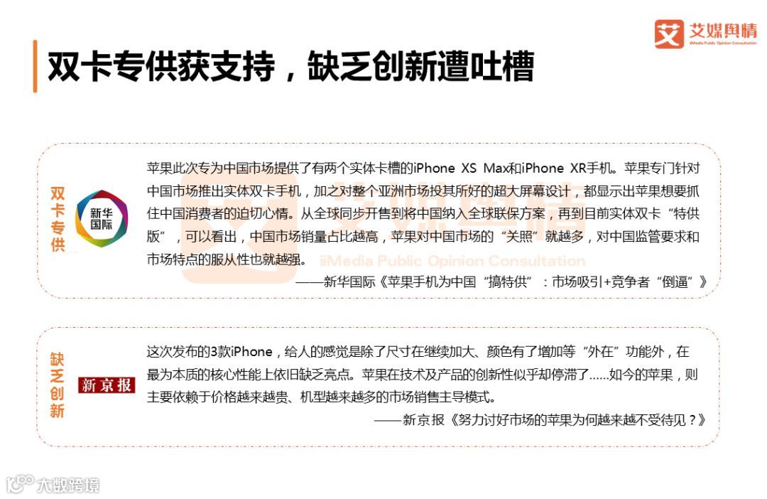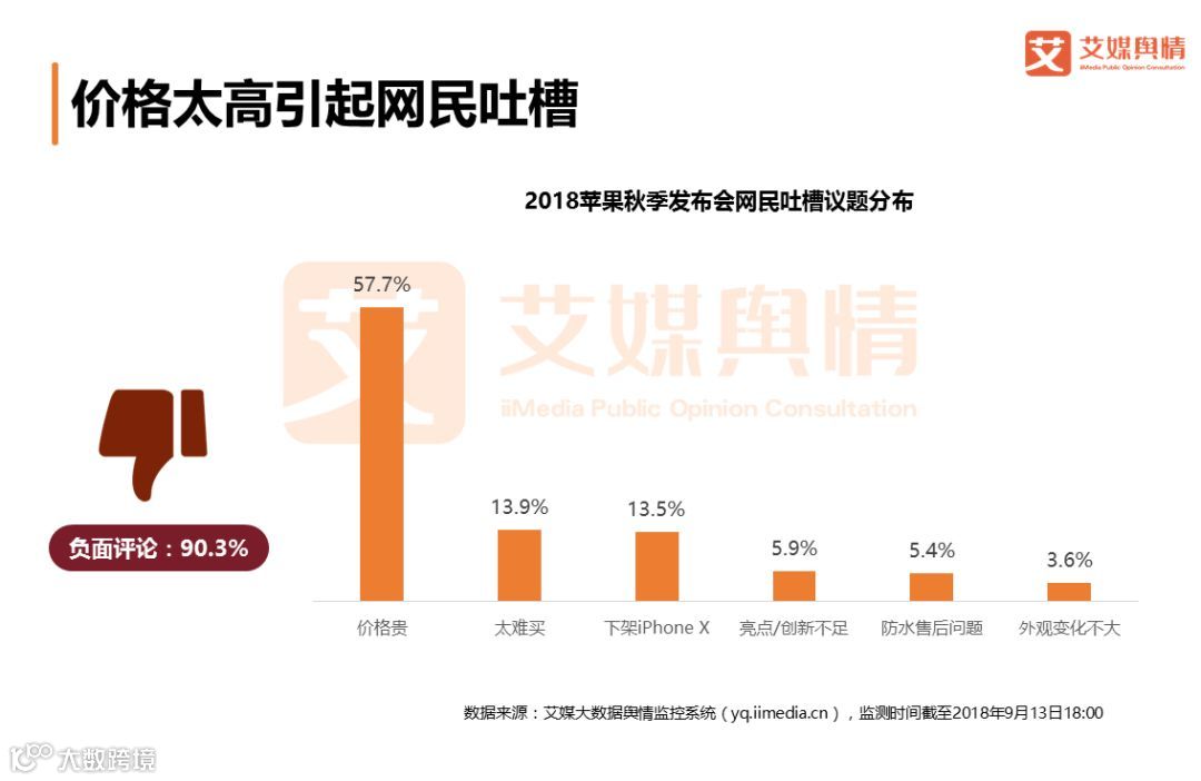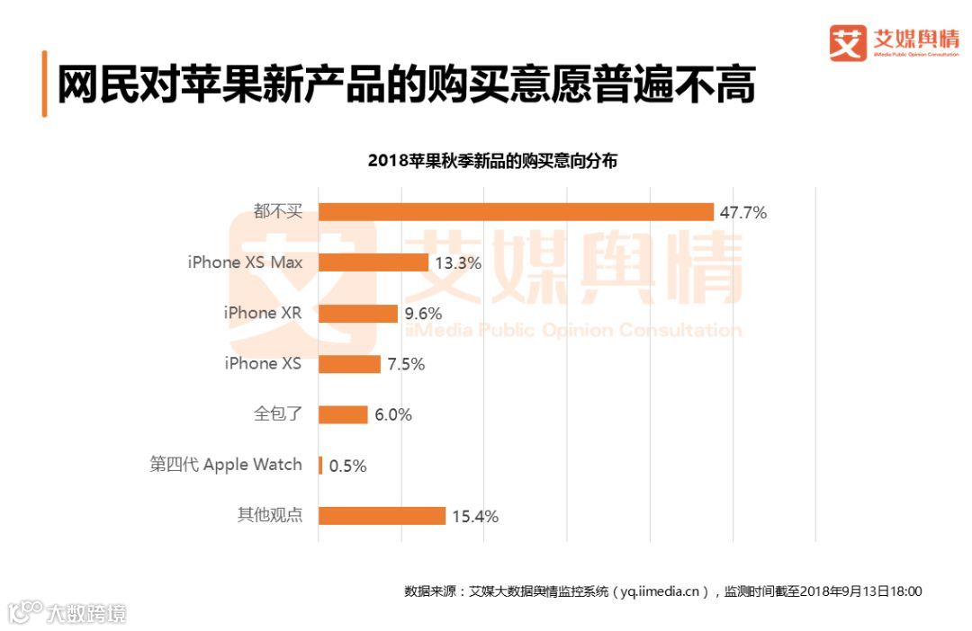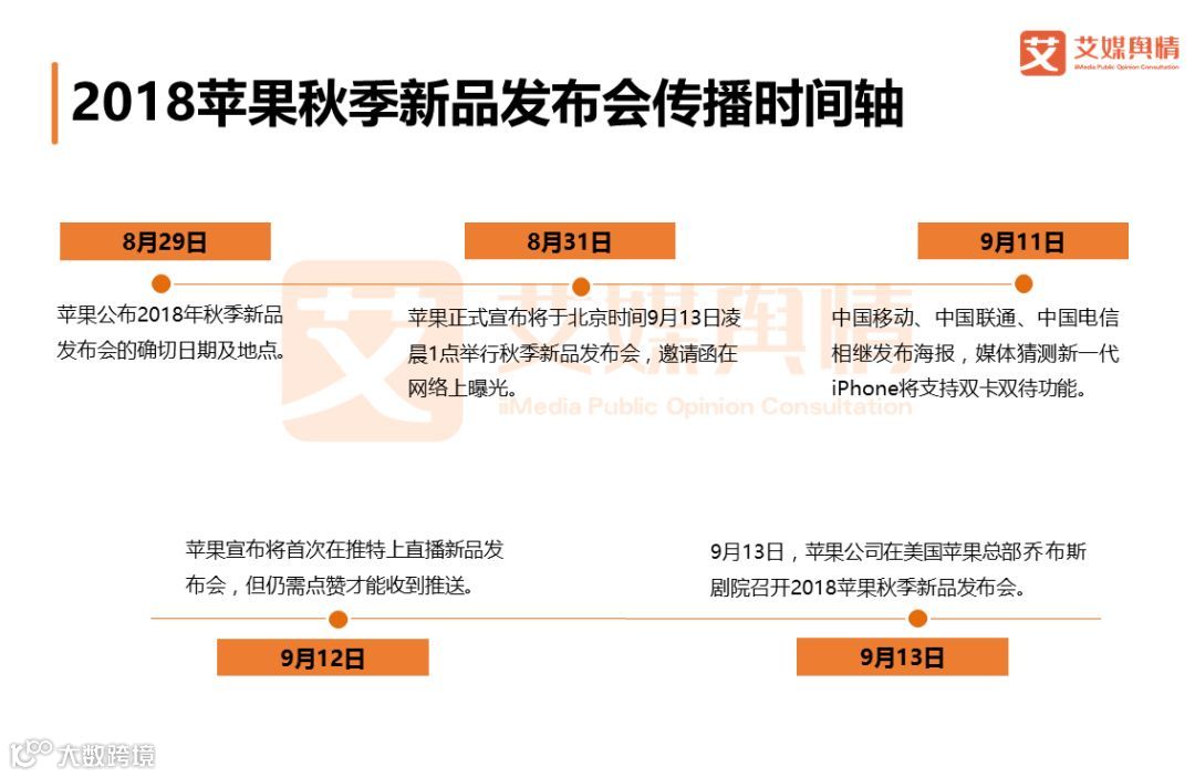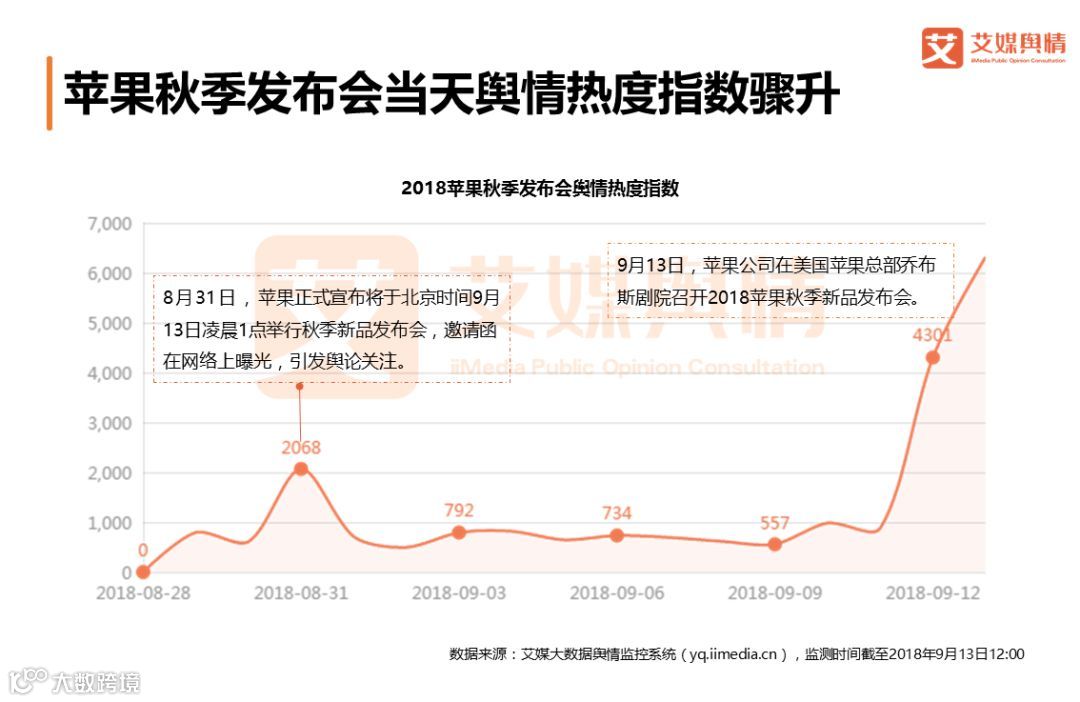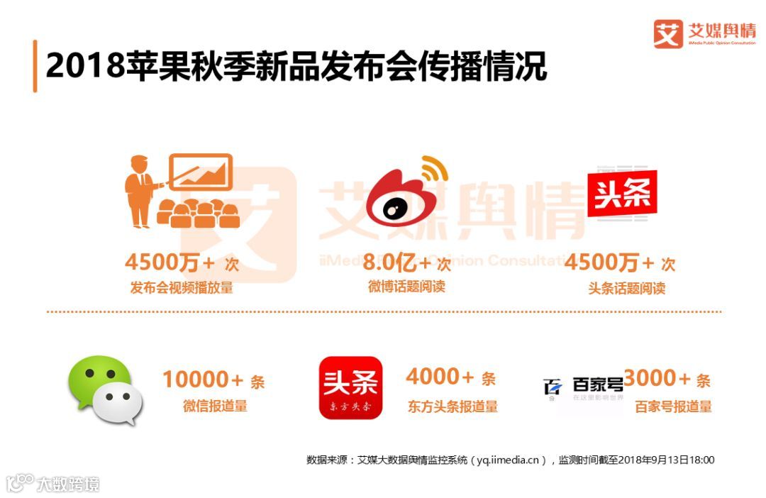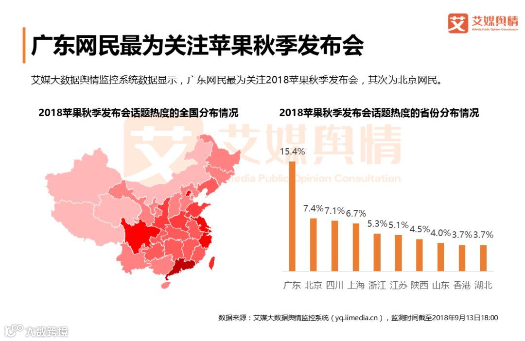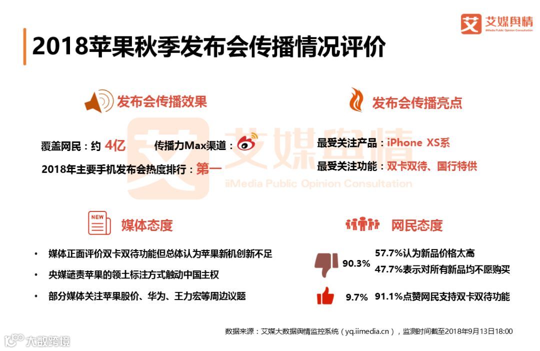 9月13日,2018年苹果秋季新品发布会如期而至。发布会覆盖约4亿网民,引起最多关注的传播渠道为新浪微博,是2018年主要手机发布会热度第一名。发布会中最受关注的产品为iPhone XS系,最受关注功能为双卡双待、国行特供。媒体态度褒贬不一,但苹果的领土标注方式触动中国主权遭央媒谴责。网民负面态度占90.3%,其中57.7%吐槽新品价格太高,47.7%网民表示不会购买。