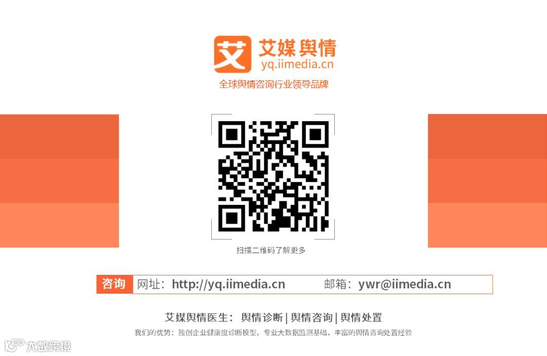 艾媒舆情(yq.iimedia.cn)是中国领先的大数据舆情咨询领导品牌,最新重磅推出舆情健康顾问产品——“艾媒舆情医生”。艾媒舆情医生基于先进的全网大数据监测和挖掘技术、可视化分析技术,为企业提供“舆情诊断、舆情咨询、舆情处置”的一站式服务,帮助企业及时预警、判断事态走向、应急处理突发舆情,维护企业良好的公共形象与用户口碑。