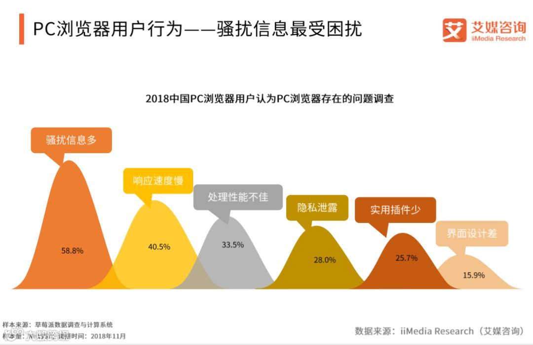 iiMedia Research(艾媒咨询)调研数据显示,在针对PC浏览器存在问题调查中,接近六成的用户反映当下PC浏览器存在的最大问题是骚扰信息多,其次超过三成用户反映浏览器响应速度慢和处理性能不佳等问题。